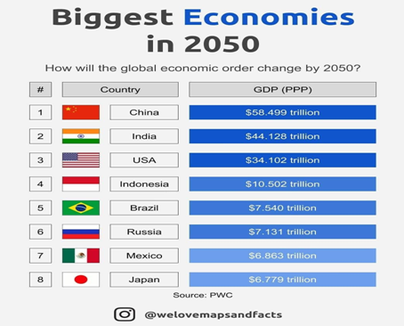 - Emerging Market Focus: Of all trends affecting international business, the most impactful is the emergence of rapid growth markets, particularly in India. Consider the long-term, large-profit play represented by this projection of the “Biggest Economies in 2050”: